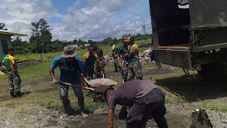 Gotong Royong ,Satgas TNI Yonif 413 Kostrad Bersama Masyarakat Perbaiki Akses Jalan Mesjid